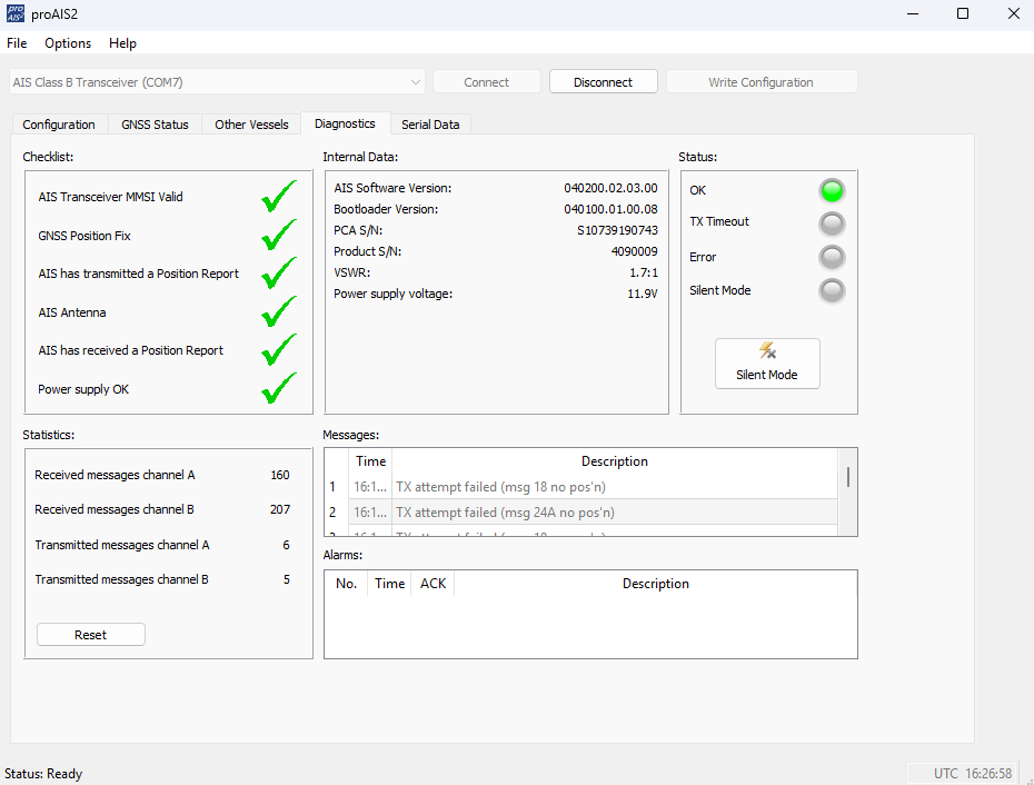 - Zur Überprüfung der Stehwelle können Sie die mitgelieferte ProAIS² Software nutzen; dazu müssen Sie einen PC via USB mit dem AIS verbinden. Das in der ProAIS² unter dem Karteireiter DIAGNOSE angezeigte Stehwellenverhältnis VSWR sollte für eine stabile Übertragung maximal bei 2 : 1 liegen; kleiner ist besser. Sollte die CD mit der ProAIS² nicht zur Hand sein kann sie hier kostenlos geladen werden.